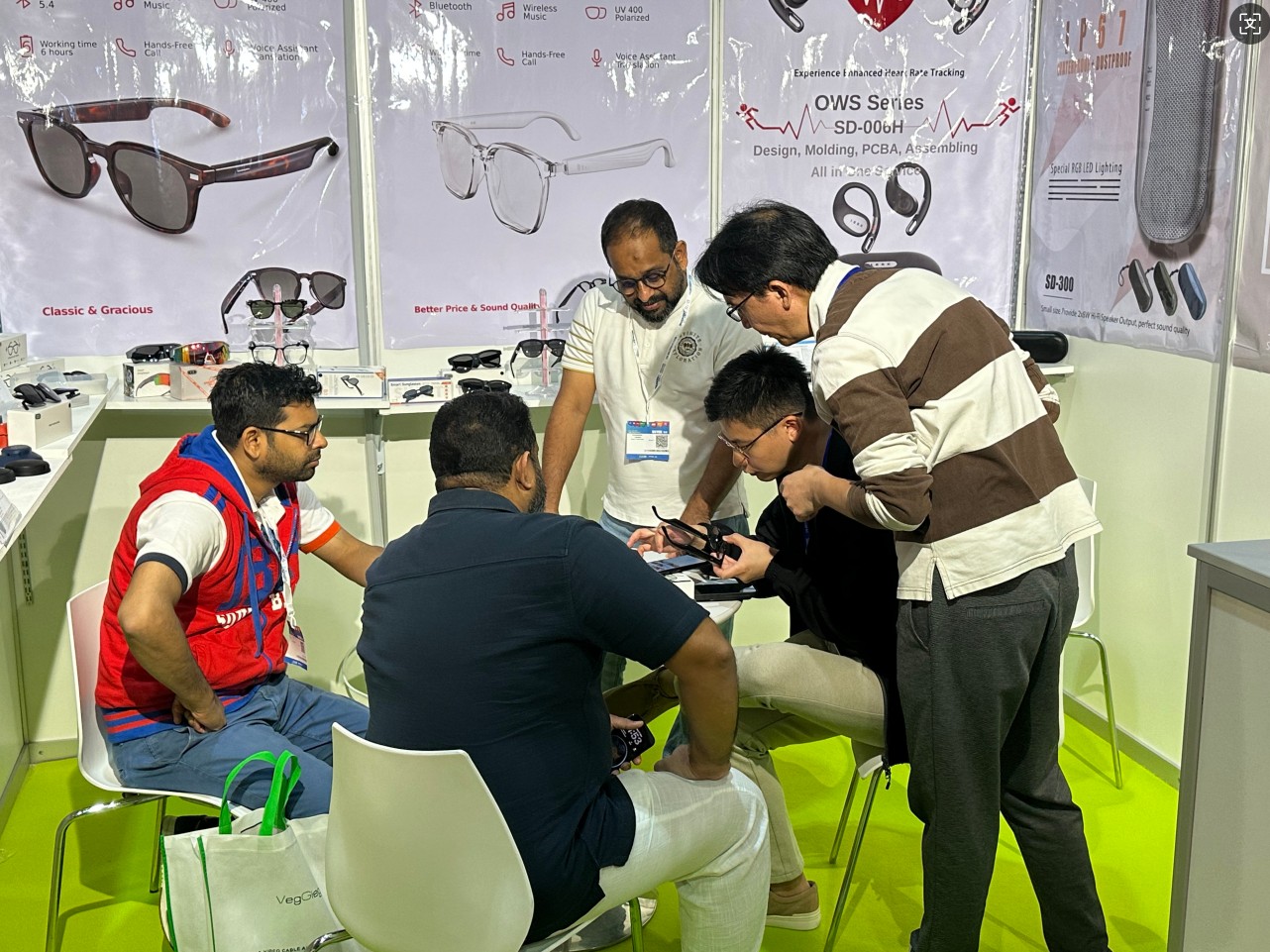 Auf der Messe präsentierten wir unseren neuesten Stil an intelligenten Kamerabrillen, Audiobrillen, kabellosen Kopfhörern, Ohrhörern mit Herzfrequenzmessung und zusammen mit einigen kommenden Artikeln für 2026 wie Gaming-Kopfhörern und Sportbrillen.